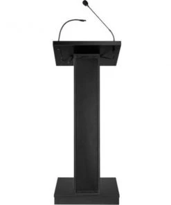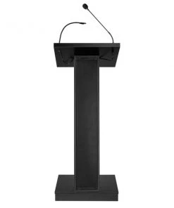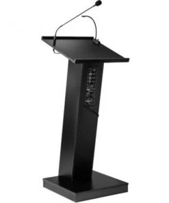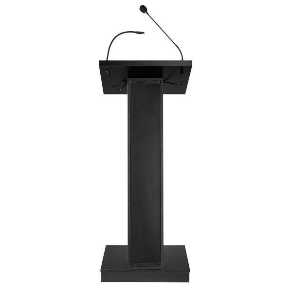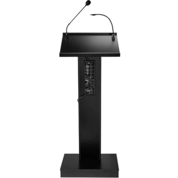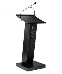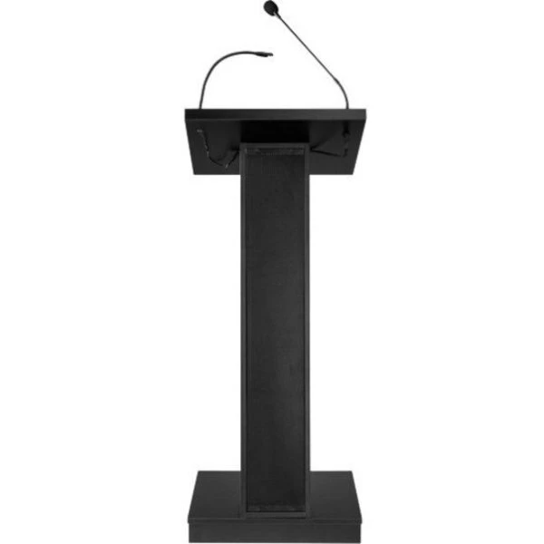 The ZED Lectern is a versatile, 40-watt sound lectern, suitable for medium-sized venues like conference rooms, meeting halls, auditoriums and cafeterias. It offers a spacious reading surface illuminated by an attractive halogen lamp. A surface-mounted digital timepiece is included for monitoring speech duration. The unit includes an attractive 21” gooseneck microphone with a factory-installed XLR mount and a tie-clip/lapel mic with 10' cable. Our newly designed amplifier along with our digitally enhanced powerful speaker system made up of four 4” 40W speakers, allows for crystal clear presentation. This unit delivers a strong and robust sound using our provided wired microphones or with our optional wireless microphones. Its elegant cabinetry features a sleek Z-shaped design with speaker system encased in an aesthetically pleasing steel grill and is finished in a black laminate to complement any room décor. Multimedia capabilities include simultaneous usage with two wired and one wireless (optional) microphones. It operates either by AC plug or with optional battery model PS12-V and features input jacks for CD players, extension speakers, USB, Bluetooth, recording outputs and playing MP3s. The unit is equipped with four concealed easy-roll casters for easy mobility. Ships assembled.