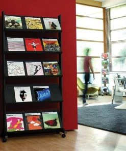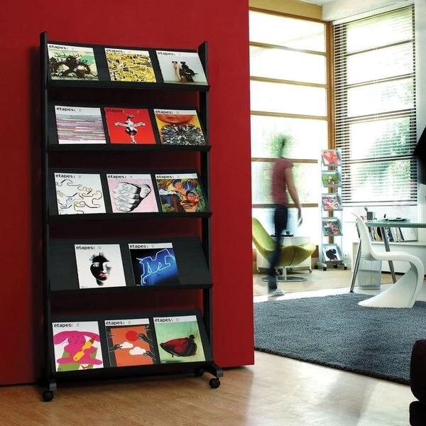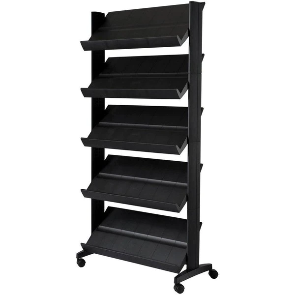 Five-shelf literature display provides a tidy storage solution to display your documents, sales brochures and more. Smooth-rolling wheels allow effortless mobility to transport your supplies from room to room. Durable construction with metal reinforcement ensures stable, long-lasting use. Adjustable shelf angles can be set to your preferred angle for optimal display options.
