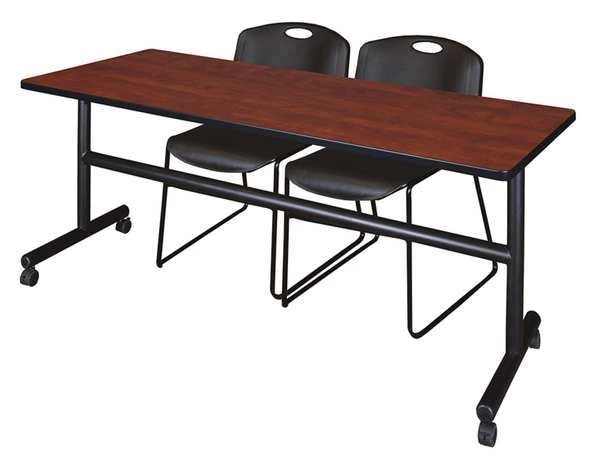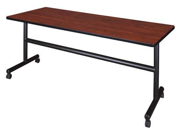 Mobile Training Table, Surface Material Laminated Melamine, Rectangle, Width 72 in, Depth 24 in, Height 29 in, Tabletop Color Family Woodgrain, Tabletop Color Cherry, Frame Color Black, Assembled/Unassembled Unassembled, Frame Material Steel, Edge Color Black, Edge Type T-Molded, Leg Type Comfort Leg, Top Thickness 1 in, Series Kobe, Load Rating 175 lb, Features Flip Top, Standards ANSI/BIFMA, Includes (4) Casters