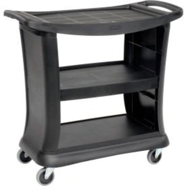 ELEGANT & VERSATILE SOLUTION FOR BACK AND FRONT-OF-HOUSE TASKS. WITH 20% MORE TOP-SHELF CAPACITY, THE EXECUTIVE SERVICE CART KEEPS YOUR BUSINESS LOOKING SMART FOR YEARS. TOP SHELF OFFERS A UNIQUE DESIGN THAT ACCOMMODATES TWO STANDARD BUS BOXES. ERGONOMIC, ROUNDED HANDLES IMPROVE MANEUVERABILITY AND COMFORT. WRAP-AROUND END PANELS CONCEAL CART CONTENTS. SOLID RUBBER BUMPER ON BASE IS GENTLE ON WALLS AND FURNITURE. DURABLE RECYCLABLE POLYETHYLENE CONSTRUCTION IS EASY TO CLEAN. ROLLS SMOOTHLY WITH 4" NON-MARKING RUBBER SWIVEL CASTERS. ASSEMBLES EASILY.