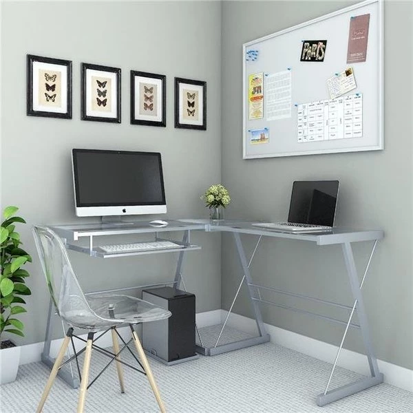 FeaturesStylish. contemporary computer desks designPolished and beveled. tempered safety glass designed to be used as corner deskDurable L shapped steel frame with a black powder-coat finishSliding keyboard tray can be mounted on either side of desk with glass top and Free CPUSpace-saving L-shape designUniversal. autonomous CPU stand includedThis L shaped computer desk with necessary hardware and toolsSpecificationsColor: SilverDimension: 51" W x 20" D x 29" HWeight: 65 lbs