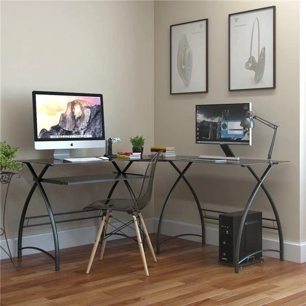 FeaturesStylish. contemporary computer desks designPolished and beveled. tempered safety glass designed to be used as corner deskDurable L shapped steel frame with a black powder-coat finishSliding keyboard tray can be mounted on either side of desk with glass top and Free CPUSpace-saving L-shape designUniversal. autonomous CPU stand includedUnique X-frame with flat metal tubingAll glass is 6 mm thickEach section supports 100 lbsSpecificationsColor: BlackDimension: 51" W x 20" D x 29" HWeight: 64 lbs