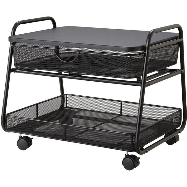 Mobile machine stand slides easily under your desk or worksurface when not in use to save space. It is mobile on four swivel casters (wheels). Two casters lock for reliable stability. Under-desk machine/printer stand includes a steel mesh basket, pullout drawer for storage and a wood laminate top with a black finish to hold printers, fax machines, letter/legal-size files or other supplies. Overall capacity is 100 lb. Powder-coated steel offers chip-resistance and long-lasting durability. Machine stand complements the entire Onyx line of products for a cohesive, professional work environment. It is great for use in small offices, home offices, reception desks, classrooms or other personal work spaces.