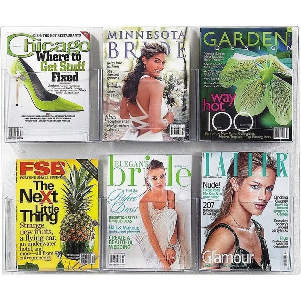 Magazine display features six compartments. Each deep pocket holds up to a 2" thickness of printed material. Pockets are made of sturdy, break-resistant polycarbonate plastic pockets with crystal-clear plastic PETG backing. Cutout feature makes cleaning easy. 7 lb. display is predrilled holes, screws, and anchors for mounting. Magazine display includes mounting hardware. Greenguard certified.