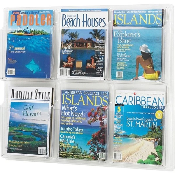 Display rack features six magazine pockets. Each pocket holds up to 1-3/4" of material. Unobtrusive, break-resistant, crystal clear plastic rack blends into any office environment. Display insert keeps magazines, pamphlets and other literature straightened while preventing curling and flopping of pocket contents. Thermoformed one-piece units have no sharp edges or corners. Use included hardware to mount to a wall. Each magazine pocket measures 9-1/4" wide x 11-1/4" high. Display rack weighs 8 lb.