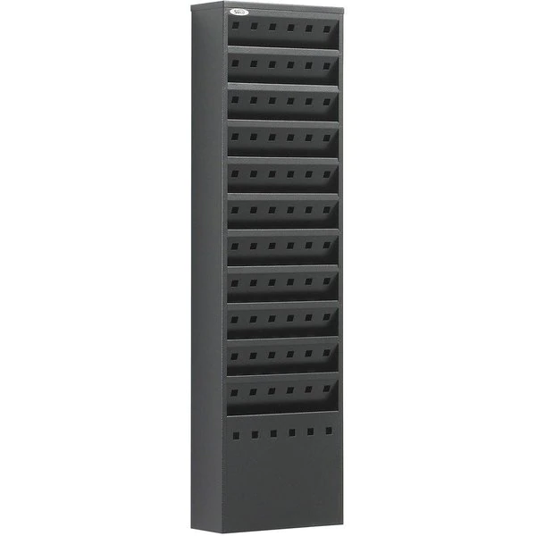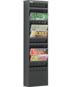 Magazine rack mounts to a wall or stands on the floor with steel base (sold separately) to provide the perfect access to your literature. Perfect for office organization, guest and reception reading materials, or school resources. Steel frame has a textured powder-coat finish to resist scratches. Magazine rack has 11 pockets and weighs 11 lb. Each pocket measures 9" wide x 3/4" deep x 7-1/4" high.