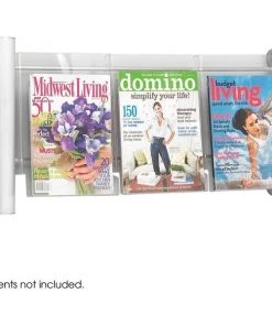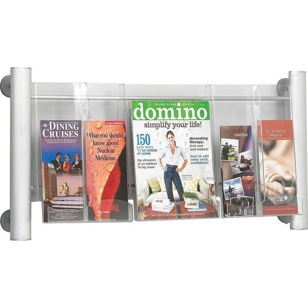 Sturdy magazine rack offers a sleek and elegant way to display your literature, pamphlets, brochures and magazines so your guests or employees can easily view them. Ideal for your reception area, waiting room, conference room, meeting areas, trade show booth, the lobby, print station, lounge area, breakroom, mailroom or media center. The silver-coated, brushed aluminum frame and clear acrylic pockets add a stylish blend to any decor. Center pocket dividers allow the three pockets to be sized for three stacks of magazines or six stacks of pamphlets. Each compartment holds up to 1" of material. Mount rack to the wall with the included hardware.