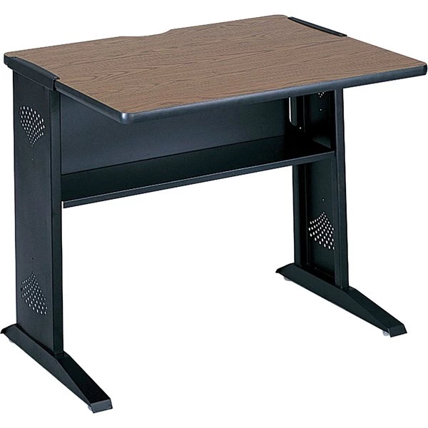 Rev up your furnishings with reversible top on this computer desk. A 1" laminate top may be reversed between Mahogany and Medium Oak to match double the decor. The top measures 35-1/2" wide x 28" deep to hold large office machines. Capacity is 200 lb. centered on the top surface. Full-width lower shelf is 6-3/4" deep to store supplies and holds up to 40 lb. Desk also includes a black steel base. Cable routing cutouts are featured for installation along a wall. To form a complete work area, combine with the Safco Fax/Printer Stand different size tables according to your space and equipment requirements.