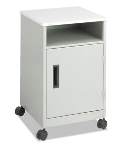 Sleek design fits neatly into smaller areas. Steel stand has a durable powder coat finish and a scratch resistant laminate top. Single-door enclosed cabinet for supply storage and fixed interior shelf. Open area under top for frequently accessed materials. Storage pocket inside door for manuals. Mobile on four casters (two locking).