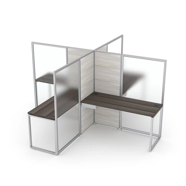 The SAPslim Cubicle System is our newest, entry-level cubicle/divider product line. This versatile cubicle divider panel system was designed with affordability and practicality in mind. Its lightweight, modular construction makes it easy to quickly assemble in any work environment. If you’re looking for a cubicle divider wall system constructed with quality (but at a lower price point) this is the system for you. Create safer, stylish, and practical workspaces for your office today. 5'x5' 4-Person Office Cubicle Workstation w/ lockbox, 65H panels in black oak w/ frosted Acrilic Wall Partitions