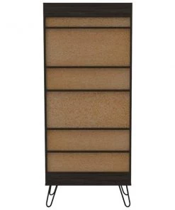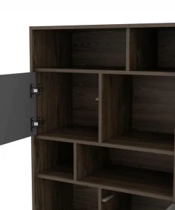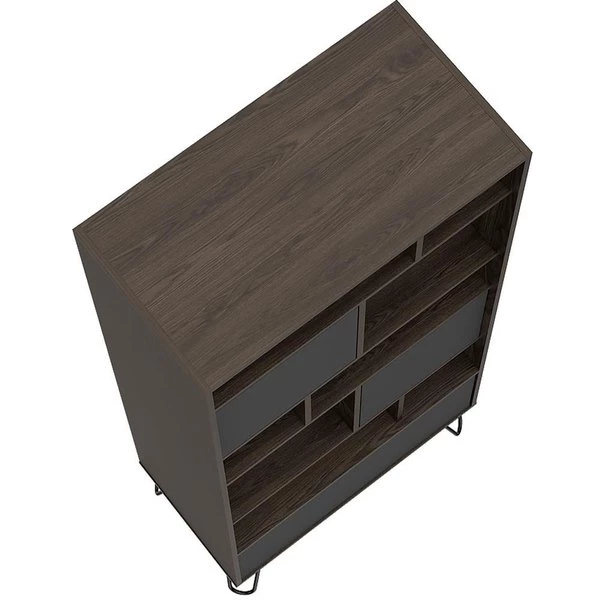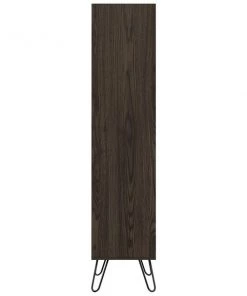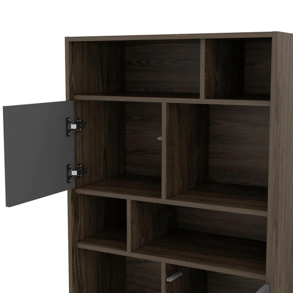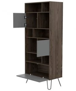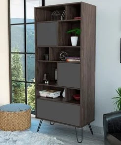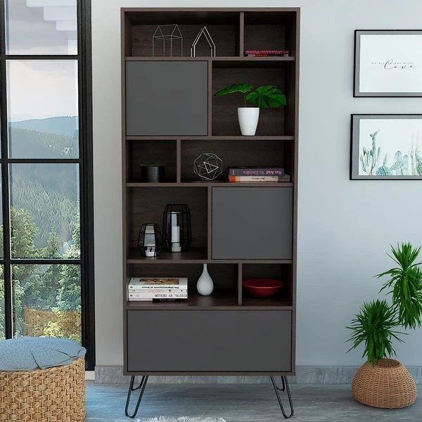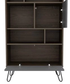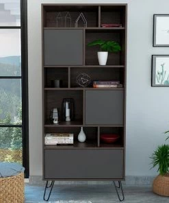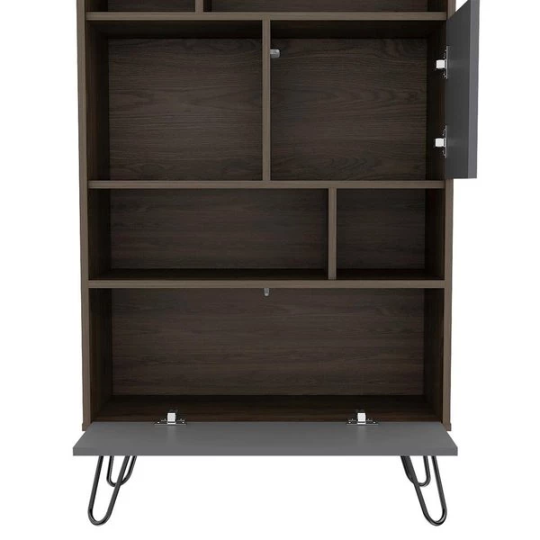A handsome upright piece with a variety of compartments, perfect for a mid-century new modern space but just as at home in an eclectic household. This piece sports curved steel hairpin legs for support so you can display your favorite items with style and ease. The bookcase has a rich deep brown color with matte gray accents to compliment any room.