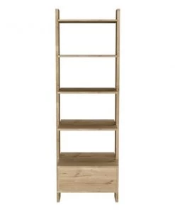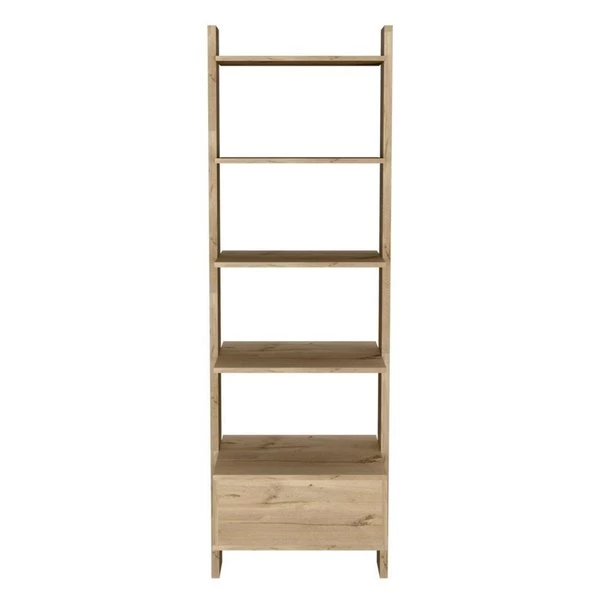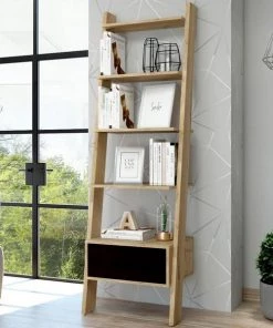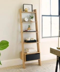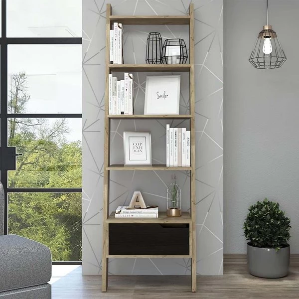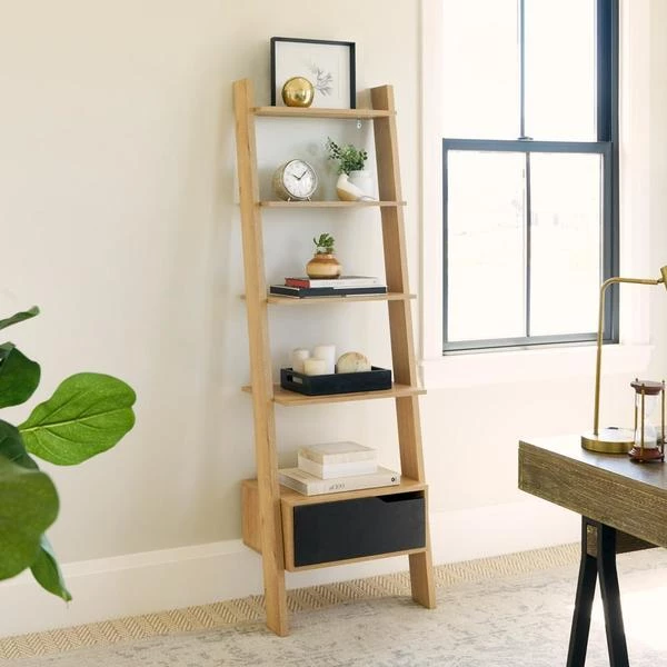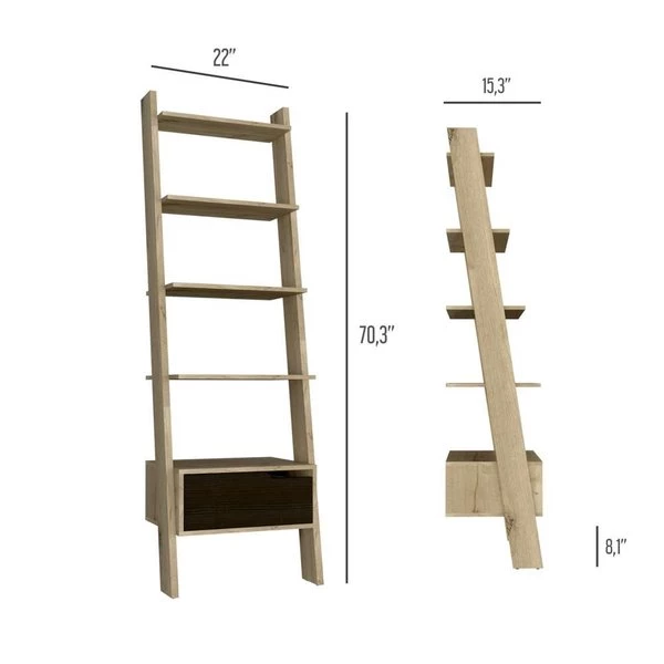 Accentuate any space with some extra surfaces to show off some of your favorite things. This leaning shelf has a light pine finish with a matte coffee accent to warm up any part of your home. This dynamic piece comes with a wall anchor and angled bracket so you can hang it anywhere that strikes your fancy.