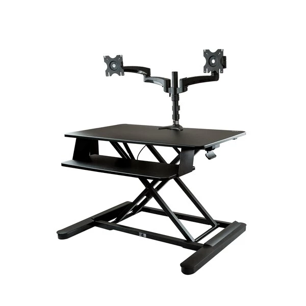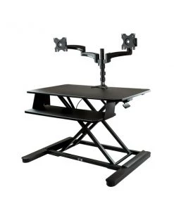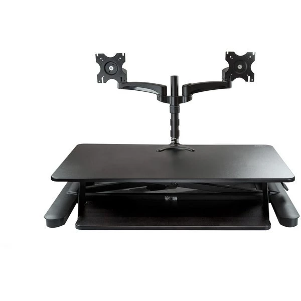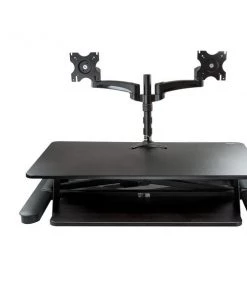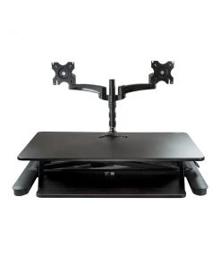 Transform your desk into a sit-stand workstation with easy height adjustment and a dual monitor mount – Sit stand desk converter with high-quality construction (steel and MDF wood) features large 35” wide work surface – Sit-stand desktop workstation features lever-controlled pneumatic spring for one-touch height adjustment (max height adjustment range 15.7”) – Dual monitor standing desk converter with two articulating arms, supporting monitors up to 24” (weight capacity of workstation with dual monitor arm 18.6 lb / 8.4 kg) – Ergonomic workstation with grommet hole mount supports dual articulating arms with a wide range of motion (360° rotation at support post and elbow / 180° at shoulder) and arm extension up to 17.5” (445mm) / standing desk converter for two monitors / standing desk converter with monitor arms