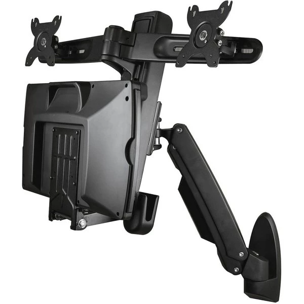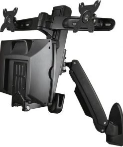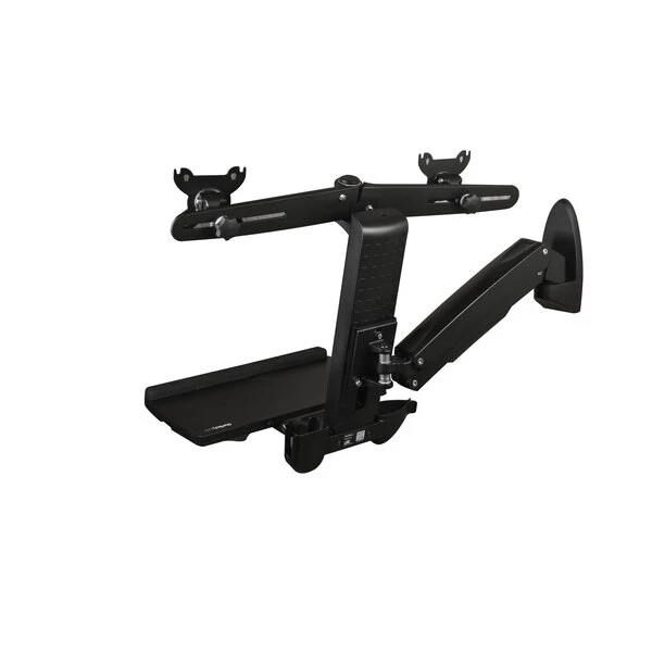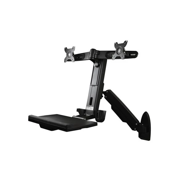 Wall Mounted Sit Stand Desk with compact design combines a dual monitor arm and keyboard tray, to easily convert your workstation into a standing desk for greater comfort and productivity – Supports two monitors up to 24" (17.6 lb/8 kg weight capacity) and works on VESA Mount compliant monitors incl Acer, HP and Samsung – Easy one-touch height adjustment with one smooth motion: simply lift the work surface up to 17.2” (436 mm) to elevate both monitor and keyboard (monitor mount has a separate height adjustment of up to 4.9" / 124 mm along the column) – Move the swing arm left or right (from -90° to 90°) and lower or raise the arm to the ideal position (the arm tucks away and the keyboard tray folds up to 90° to save space when not in use) – Height Adjustable Standing Desk Converter / adjustable computer desk / adjustable desk riser / adjustable standing desk / computer wall mount / Ergonomic Desk / height adjustable desk / sit stand desk converter / sit stand workstation