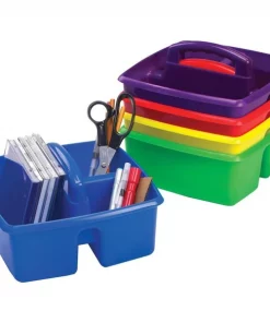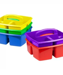 Prepare and organize craft projects ahead of time with these art caddies. Or you can organize essential supplies for grab-and-go usage. Each caddy features a comfort-grip handle; one large compartment and two small compartments. They are a durable and made of easily washable, dishwasher-safe plastic. They also stack neatly and nest deeply when not in use. Bright color assortment includes blue, yellow, green, red and purple.