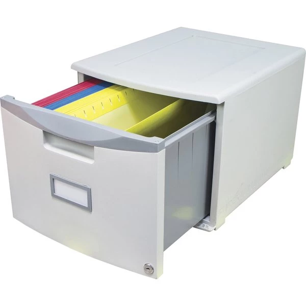Functional and lightweight, this filing drawer is the perfect storage solution for those in need of professional filing. The durable polypropylene construction allows this drawer to be stackable up to six units high for space-saving organization. Built-in label holder offers a convenient way to quickly identify your stored contents. Lockable drawers prevent unauthorized access to keep your files and documents safely contained. Plus, its durable design resists scratches, moisture and rust for long-lasting organization. 18" filing drawer is designed to hold letter-size or legal-size hanging file folders (sold separately).