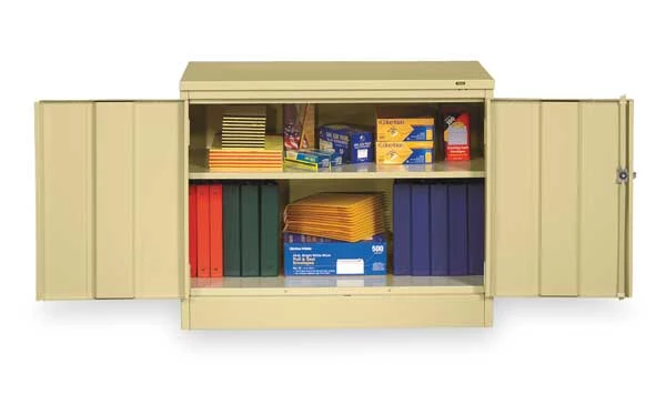 Shelving, Commercial, Cabinet Height Range Desk or Table Height, Cabinet Door Type Standard, Assembled, Height of Cabinet 30 in, Width of Cabinet 36 in, Depth of Cabinet 18 in, Method of Construction Welded, Number of Cabinet Shelves 2, Shelf Capacity 150 lb, Number of Doors 2, Cabinet Color Sand, 24 Gauge, Locking Cabinet Yes, 3 Points Locking Points, Cabinet Locking Mechanism Keyed, Cabinet Handle Style Swing, Standards SCS, ANSI/BIFMA