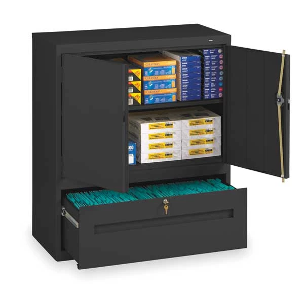 Lateral File Drawer Cabinet, Base Type Leveling, Cabinet Color Black, Cabinet Storage Components Drawers, Shelves, Frame Assembled Assembled, Mobility Stationary, Number of Shelves 1, Overall Depth 18 in, Overall Width 36 in, Vertical Shelf Clearance Not Applicable, Audit Trail Storage None, Cabinet Material Steel, Duty Rating Light Duty, Door Type Solid, Door Handle Type Recessed Pull, Door Locking Points 3, Overall Height 42 in, Load Capacity per Shelf 200 lb, Lock Type Keyed