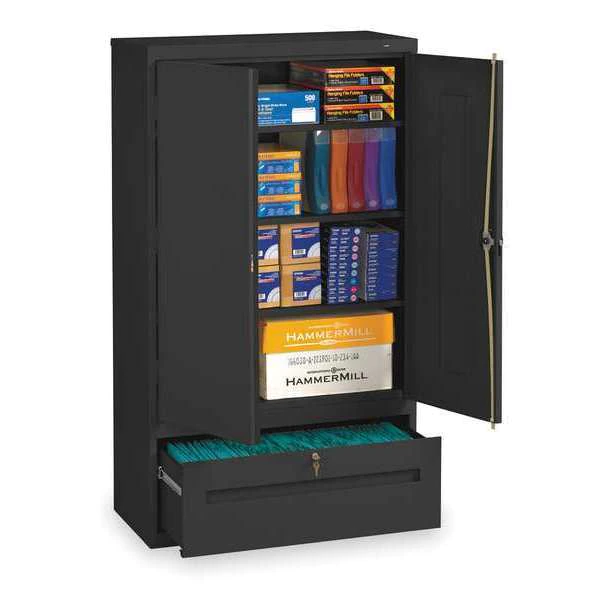 Lateral File Drawer Cabinet, Base Type Leveling, Cabinet Color Black, Cabinet Storage Components Drawers, Shelves, Frame Assembled Assembled, Mobility Stationary, Number of Shelves 3, Overall Depth 18 in, Overall Width 36 in, Vertical Shelf Clearance Not Applicable, Audit Trail Storage None, Cabinet Material Steel, Duty Rating Light Duty, Door Type Solid, Door Handle Type Recessed Pull, Door Locking Points 3, Overall Height 66 in, Load Capacity per Shelf 200 lb, Lock Type Keyed