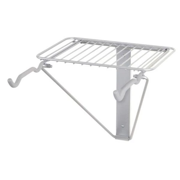 FeaturesFolds down to save space when neededMax load: 80 lbsThick vinyl coated arms protect bike finishUseful shelf for accesoriesSpecificationsDiemension: 13.75" H x 20.5" W x 1.9" LWeight: 4.5 lbs