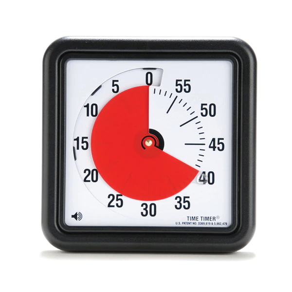The Time Timer Original 8" is an ideal 60 minute timer for small to medium groups, can stand alone or hang on the wall and is perfect for meetings, presentations, classrooms and student testing. Benefits • Increase productivity by breaking projects into manageable segments • Keep meetings and appointments on schedule • Manage the stress of traveling by showing "how much longer" • Reduce conflicts over whose turn it is with computers and games • Trade chaos for order in family and household routines Features • Patented red disk that disappears as time elapses • No loud ticking, no distractions, no setup required • Optional audible signal when time is up • Free-standing or wall-mounted options • One AA battery is required for operation (not included)