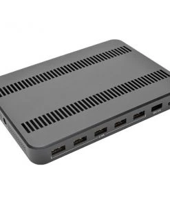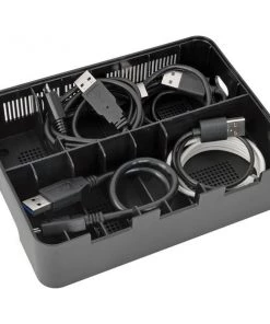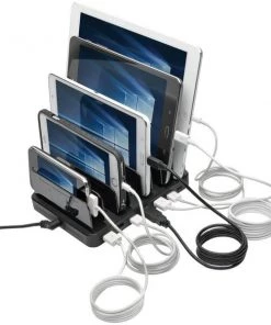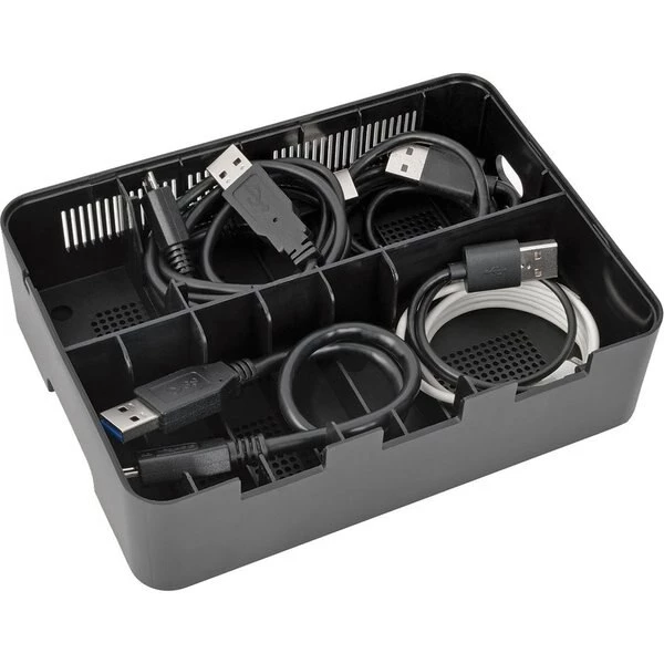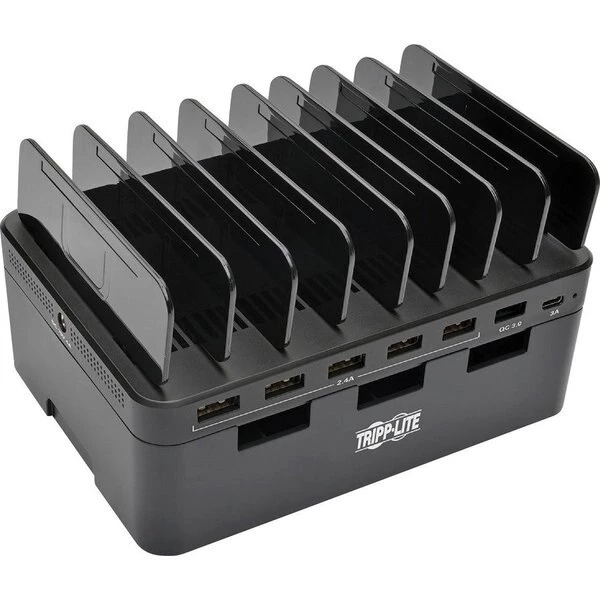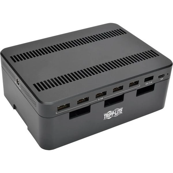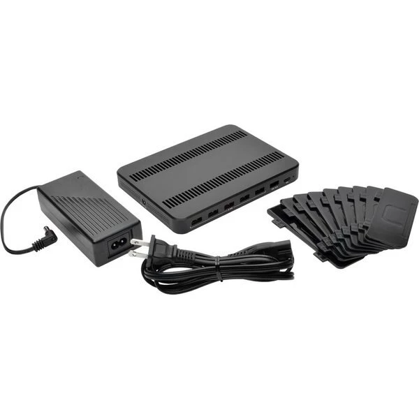 USB charging station features seven USB-A ports, each capable of delivering up to 5V, 2.4A, to charge even battery-intensive devices. Charging station doubles as a storage unit by providing space to neatly organize cabling while your devices charge. When not in use, cables can be stored in the compartment and kept out of the way. Adjustable brackets accommodate the number and size of the devices being charged. The unit protects against overheating, overcurrent and overcharging. Plus, it stops charging as soon as your devices' batteries are at full capacity to protect your battery life. Each port complies with USB Battery Charging (BC) specification v1.2. Charging station does not require a computer to let you take it anywhere AC power is available.