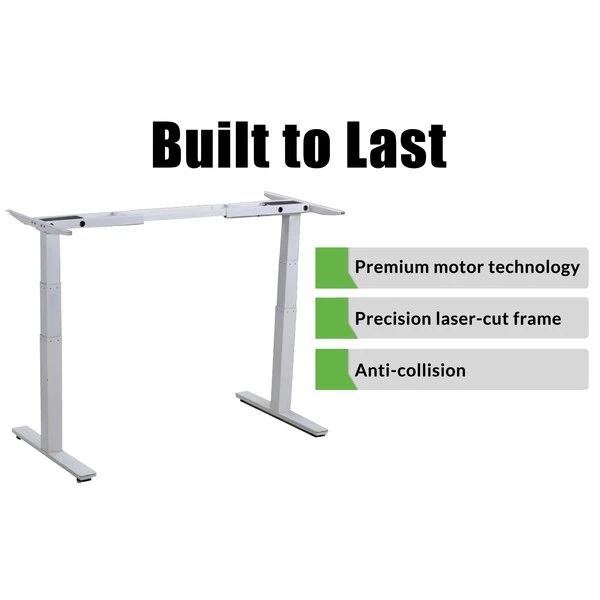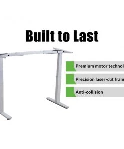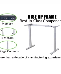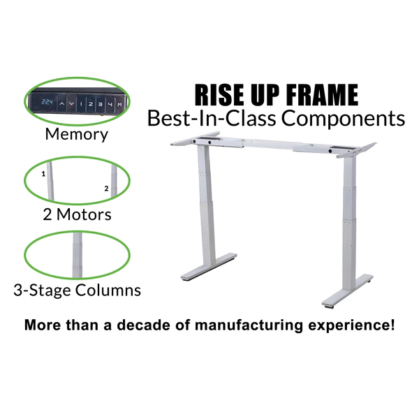 Flow between sitting and standing with this premium, motorized standing desk frame. Uncaged Ergonomics crafts every Rise Up standing desk base with all the features you need to create a long-lasting ergonomic home/commercial office desk. The precision, laser-cut steel desk frame has 2 “best in class” motors with over a decade of proven durability, easily programmable memory settings for 1-touch adjustments, and is adjustable in width to accommodate your unique space and desktop size. Quickly move from sitting to standing with this durable, purpose-built electric standing desk base. Special features of the Rise Up Electric Standing Desk Frame with Dual Motors, Memory * Adjustable Height (26-51.6”). Tall adjustable height range properly fits almost everyone * Adjustable Width (42.3-71”). Holds a range of desktop sizes * 2 Motors (1 in each leg) for a fast, smooth, even height adjustment * 3-stage legs (more height range and heavier load capacity) * Anti-Collision Technology helps prevent lowering on top of an object CONTROL PANEL: * Automatic Up/Down Adjustment * 4 Memory Settings (for 1-touch adjusting) * LED Height Readout Screen No desktop is included with this electric standing desk base. Uncaged Ergonomics has been manufacturing this premium electric stand up desk for almost a decade. You’re purchasing from a company with a proven track record that’s continually worked to advance the features of the Rise Up powered standing desk. We believe the motors are the key component of any electric adjustable height standing office desk and use industry-leading dual-motor technology to ensure a fast, smooth, even, efficient height adjustment. The quality of our electric standing desk is apparent from the minute you open the “fedex-resistant” packaging. Bring your own desktop and enjoy the freedom to sit, stand and move with our ergonomic adjustable height electric stand up office desk!