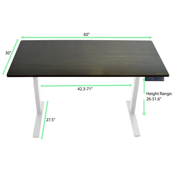 RISE UP electric standing desk is built with best-in-class components and has over a decade of field-tested durability in the most rigorous office environments. Improve your posture by customizing desk height to fit your physique and enjoy the freedom to flow through your work day sitting or standing with Rise Up electric stand up desk. RISE UP’s motorized office desk frame features: dual motors, memory keyboard, 3-stage columns, an adjustable height + width laser cut frame. We build Rise Up with two premium motors: dual motor standing desks are faster, smoother, and have a longer lifespan than the cheap single motor models. In electric standing desks, the motors make a huge difference in function & durability. With over a decade of R&D, our motors are built to last and feature the latest anti-collision technology. The memory keypad makes adjusting your office desk height simple: use the automatic up/down controls and store 4 of your favorite height settings for an even quicker adjustment. The premium 3-stage lifting columns create a taller height range and safely lift heavier loads than the cheap 2-stage models. This adjustable height electric desk frame is topped with a beautiful 60×30” solid bamboo desktop with a premium non-scratch finish that looks great in any office environment. ** Features of Rise Up the Best Electric Bamboo Standing Desk ** – 3-STAGE LIFTING COLUMNS more height range and a heavier lifting capacity – DUAL MOTORS fast, smooth, even adjustment – ADJUSTABLE WIDTH FRAME fits your space – ANTI-COLLISION helps prevent lowering the desk onto an object ** SPECS ** – Frame Width: 42.3-71” – Height Range: 26-51.6” – Frame Depth (front-to-back): 25.6” – Lifting Capacity: 250 lbs – Frame Material: Steel – Frame Features: 2 Motors, 3-Stage Lifting Columns, Anti-Collision – Control Panel: Auto Up/Down + 4 Memory Presets – Desktop Size + Material: 60×30”, Solid bamboo
