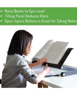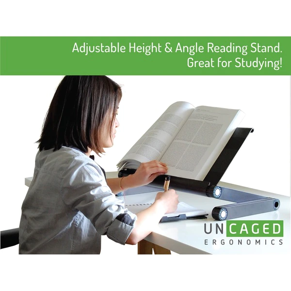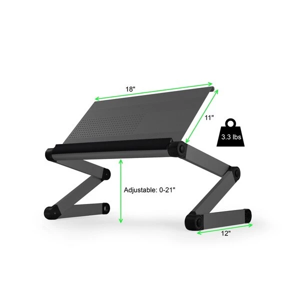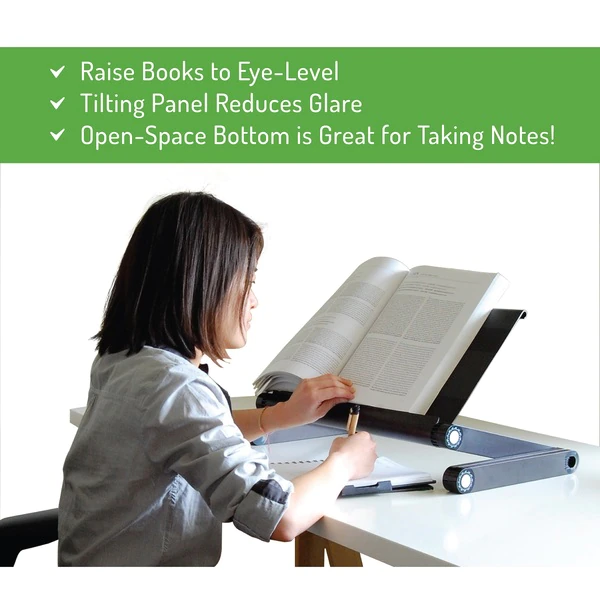WorkEZ Executive is an adjustable laptop stand that works everywhere you do – on the couch, in bed, sitting at a desk and even standing. The lightweight, durable stand is made of premium-grade, anodized aluminum and naturally dissipates heat to cool laptops. Each leg has special joints that accordion the stand up and down, adjusting the height and angle to perfectly position screens for optimal comfort. Not just for laptops, WorkEZ Executive also holds tablets, books, and monitors in a more ergonomically-correct position. When you're done using it, the entire stand collapses down into a thin, flat package. USES: (1) LAP DESK: Compute more comfortably laying in bed or lounging on the couch. Raise laptops off your lap, keep them cool, and tilt screens to reduce glare. (2) ADJUSTABLE LAPTOP RISER: The perfect way to improve your posture! Comfortably elevate screens to eye-level, tilt screens to reduce glare, cool laptops, free-up space and organize your desk. (3) LAPTOP STANDING DESK: A simple, affordable way to stand up and work on any desk. Elevate screens up to 21”, tilt the panel, and quickly collapse the stand when you’re finished. (4) READING STAND: An amazing adjustable height and angle ergonomic reading stand – raise books to eye-level, tilt the page, and free up desk space. The perfect textbook holder for students! (5) COMPUTER MONITOR RISER: Raise monitors to eye-level with this adjustable-height stand. SPECS: (1) Outside Dimensions: 22x12x3 in (2) Panel Size: 18×10 in (3) Width Between Legs: 20.8 in (4) Product Weight: 3.3 lbs (5) Material: Aluminum