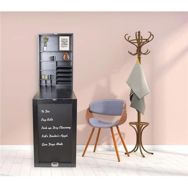This mountable wall cabinet with a stylish chalkboard front easily folds out (Murphy bed style) and converts into a convenient workspace that is perfect for your computer usage scrapbooking crafting sewing paying bills homework and so much more! Also can use as a bar or serving table when you have company!_ The front of the cabinet is a chalkbaord and when opened there are multiple storage units to keep your belongings.Chalkboard folds up neatly and compactly.Convenient wall mount design.Storage area with varied shelf sizes for organization.Laminated MDF construction.Product Size:When folded framed chalkboard dimensions are 19.7" L x 7" D x 31.5" HDesk is 18" L x 29" H Overall 19.7" L x 36" D x 60" H when fully opened.USA/Woman Owned and Operated Free & Fast Shipping.