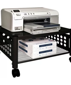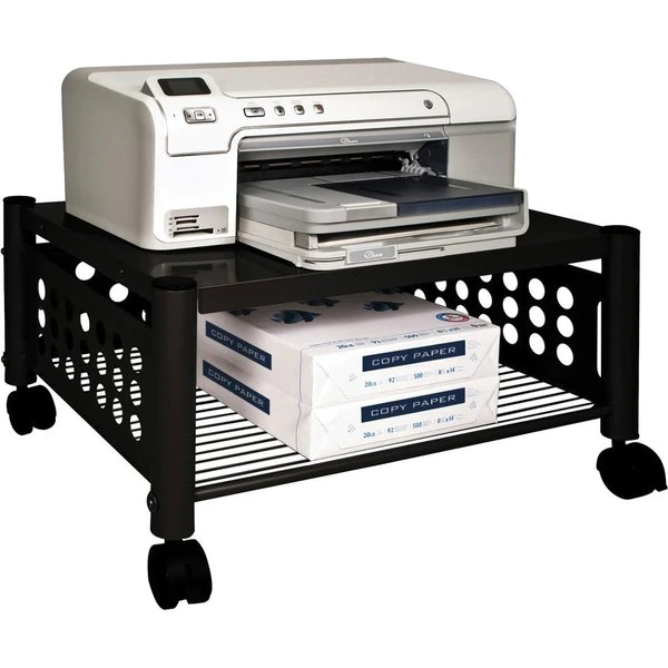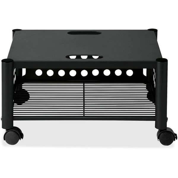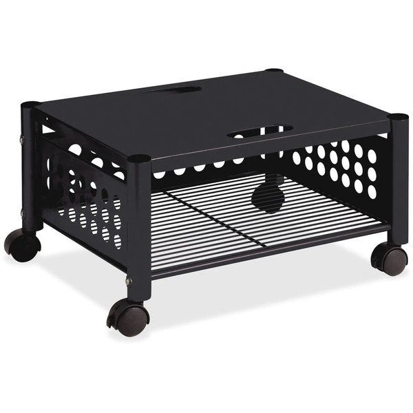 With durable steel and wire construction, versatile machine stand is sturdy enough to hold a printer, fax machine or personal copier. Two convenient openings let you route cords/cables and use them as a handle to pull stand from beneath worksurface. Easy-to-assemble, underdesk machine stand rolls easily on four twin-wheel casters (two locking).