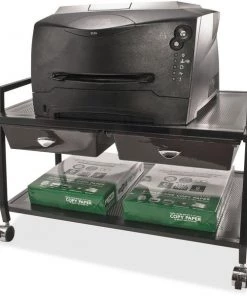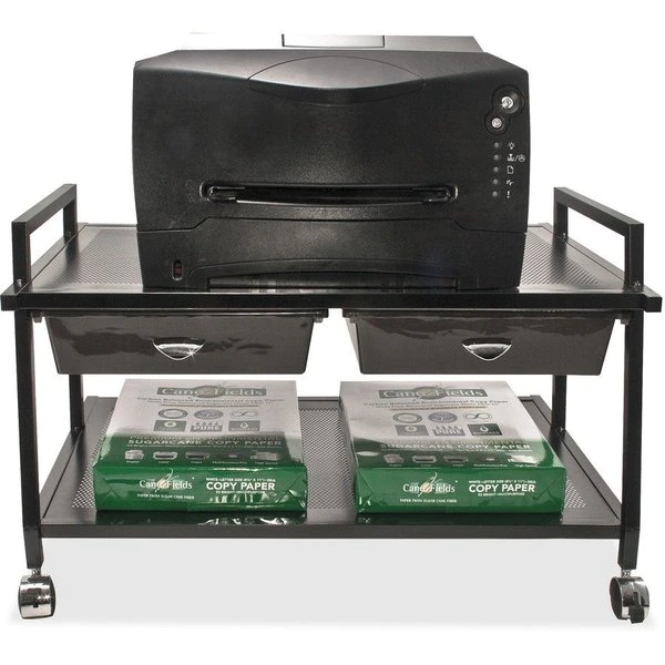 With durable steel construction, this versatile machine stand is sturdy enough to hold a personal printer, fax machine or copier. Two convenient drawers below the top shelf can hold printer supplies, specialty paper and more. Easy-to-assemble, underdesk machine stand rolls easily on four twin-wheel casters (two locking).