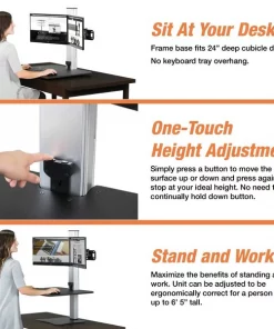 Electric Dual Monitor Standing Desk, High Rise(TM) Series, Overall Width 28 in, Height Range 0 in to 20 in, Overall Depth 23 in, Color Base Silver, Color Top Black, Base Material Steel/Aluminum, Top Material Laminate, Assembly Required, For Use With Keyboard, Monitors, Includes (2) Monitor Holders, Power Cord, Push Button Sit