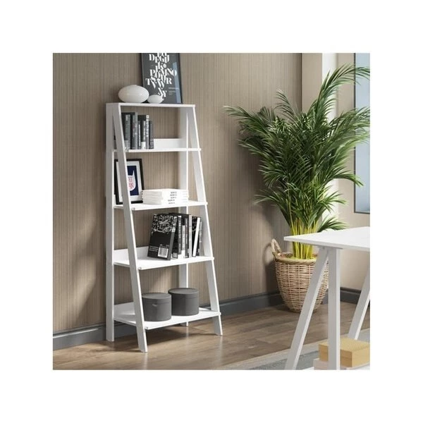 Fun and functional. this bookcase will fulfill all of your organizational and decorating needs. Built with 4 shelves in a ladder frame. this up-to-date unit is made of high-grade MDF that will display any of your media and trinkets wonderfully. Features4 Shelves for ample storageHigh-Grade MDFPainted finishReliable constructionSpecificationsColor: WhiteSize: 55 in.Dimensions: 55 H x 24 W x 13 L in.Weight: 23 lbs