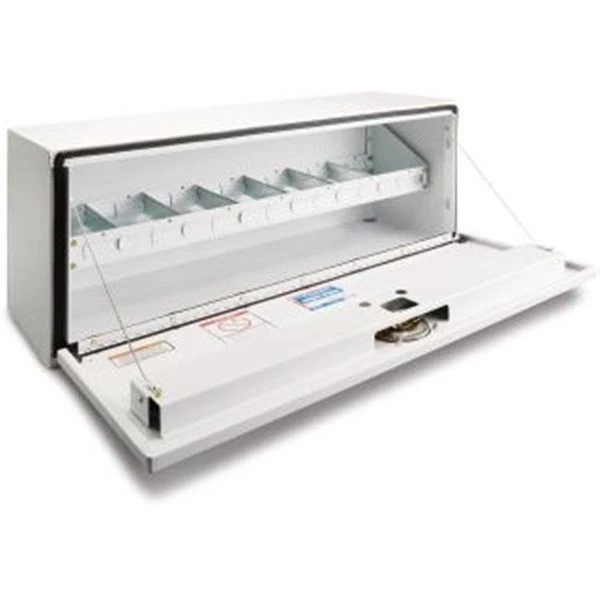 Perfect for Hi-Side and Super-Side boxes. the Model 200-3 Accessory Parts Cabinet Tray measures 41-1/2 in long and 9-1/2 in wide. The steel cabinet tray in Brite White ARMOR-TUFPowder Coat finish ensures years of dependability comes with adjustable dividers and can be bolted to back wall of the box. FeaturesTrays are 16 gauge steel with adjustable dividers bolts to back wall of cabinetFits Hi-Side and Super-Side boxesBrite White Powder Coat finish ensures years of dependabilitySpecificationsColor: WhiteMaterial: SteelDimension: 3-1/2" H x 9-1/2" W x 41-1/2" LWeight: 17
