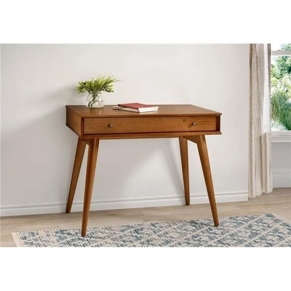 Camaflexis Mid-Century Modern Desk combines functionality with sleek lines and geometric forms. It offers a simple sophistication to any modern space. With a 100% solid wood construction this desk is built to last! In addition. a protective finish highlights the natural patterns of the wood grains. The desks clean design and round tapering legs make it the perfect complement to the Camaflexi Mid-Century Modern Bed collection. Furthermore. the large desk top offers plenty of room for working at home. A single. extra-large drawer provides ample storage space. The drawer is equipped with metal roller glides with safety stops for smooth and effortless motion. Customize your space with the natural simplicity and beauty found in these Mid-Century Modern Bed Side Tables! SpecificationsFinish: CastanhoWeight: 41.5 lbs