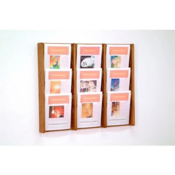 Wooden mallet's acrylic & oak wall displays are specifically designed to hold single sheets of paper without drooping. This beautiful wall mountable rack will showcase your literature in style. Our innovative overlapping shelves allow you to display more literature in less space. The frame is finished in a medium oak color.