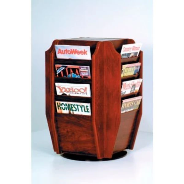 Countertop magazine rotary display – medium oak this 18"w x 18"d x 25"w unit has 3/4" thick solid oak sides for long lasting durability and dependability. Allows you to conveniently place literature on counter tops and table tops for easy access and efficient, organized storage. Magazine pockets are 9"w x 3/4"d.