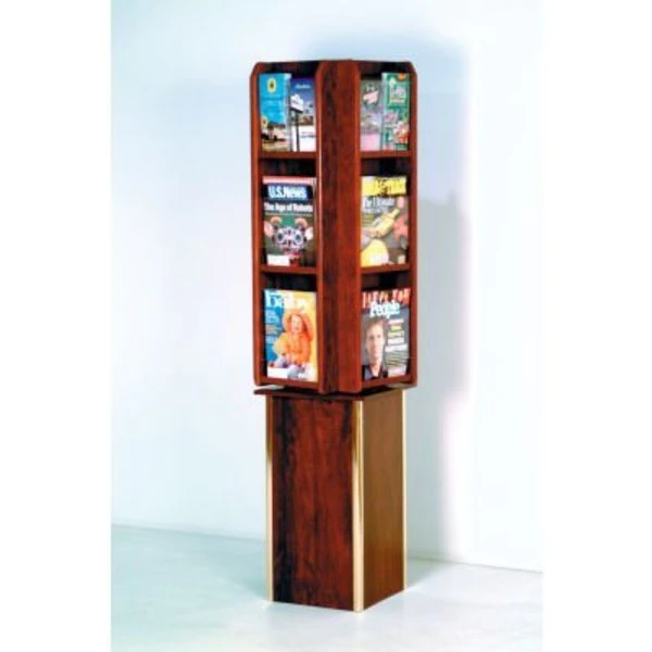 Free standing literature rack conveniently displays up to 12 magazines or 24 brochures in a compact space. Constructed with solid oak sides and clear acrylic panels to fully display all of your literature. The frame is finished in a mahogany color.