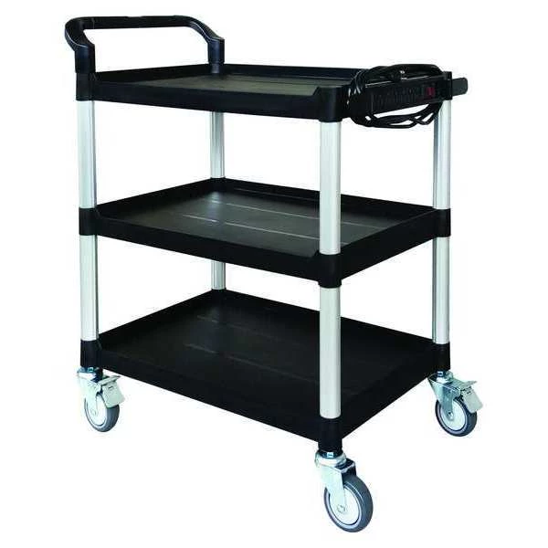 Cart, Material Polypropylene/Glass Fiber, Color Black, Monitor Size 26 in, Number of Shelves 3, Height 37 3/16 in, Width 32 5/8 in, Depth 19 5/16 in, Load Capacity 400 lb, Caster Type (4) 4 in Swivel Casters (2 Locking), Includes UL Listed Power Strip with 10 ft Cord and Power Strip Holder