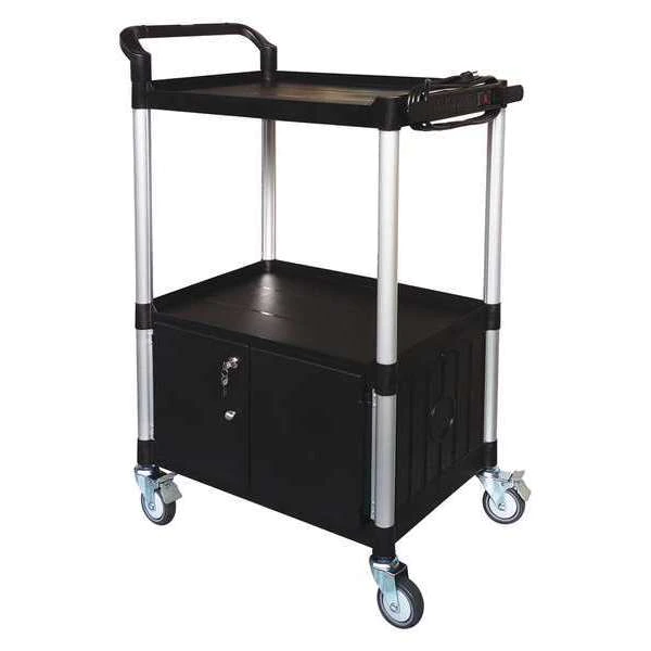 Cart with Cabinet, Material Polypropylene/Glass Fiber, Color Black, Monitor Size 26 in, Number of Shelves 3, Height 47 1/4 in, Width 32 5/8 in, Depth 19 5/16 in, Load Capacity 400 lb, Caster Type (4) 4 in Swivel Casters (2 Locking), Includes UL Listed Power Strip with 10 ft Cord and Power Strip Holder