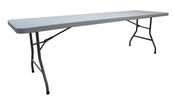 Folding Table, Surface Material Blow Molded Polyethylene, Rectangle, Width 30 in, Length 96 in, Height 30 in, Tabletop Color Family Gray, Tabletop Color Gray, Frame Color Gray, Assembled/Unassembled Assembled, Frame Material Steel, Edge Color Gray, Edge Type Bullnose, Leg Type Wishbone, Table Material Blow Molded Polyethylene, Top Thickness 2 in, Load Rating 1000 lb