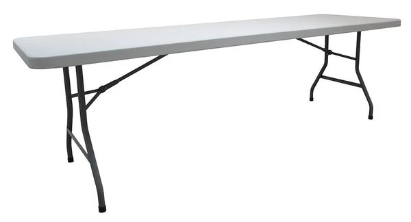 Folding Table, Surface Material Blow Molded Polyethylene, Rectangle, Width 30 in, Length 96 in, Height 30 in, Tabletop Color Family White, Tabletop Color White, Frame Color Gray, Assembled/Unassembled Assembled, Frame Material Steel, Edge Color White, Edge Type Bullnose, Leg Type Wishbone, Table Material Blow Molded Polyethylene, Top Thickness 2 in, Load Rating 1000 lb, Includes 40 lb Table