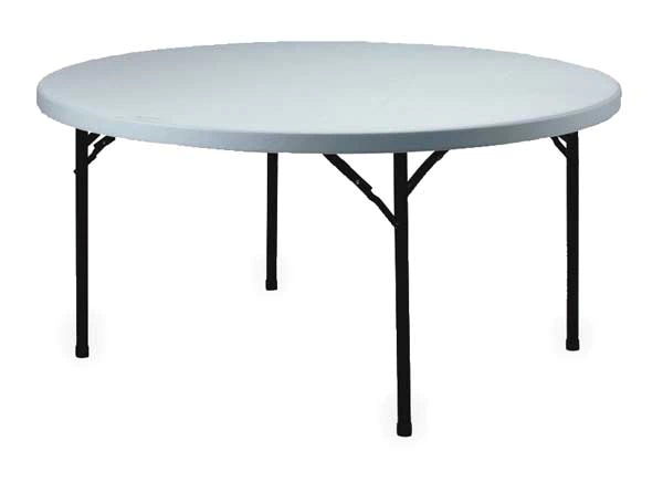 Folding Table, Surface Material Blow Molded Polypropylene, Round, Diameter 60 in, Height 30 in, Tabletop Color Family White, Tabletop Color White, Frame Color Gray, Assembled/Unassembled Assembled, Frame Material Steel, Edge Color White, Edge Type Bullnose, Leg Type Straight, Table Material Blow Molded Polypropylene, Top Thickness 2 in, Load Rating 200 lb
