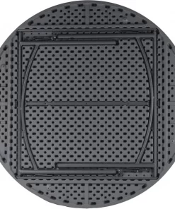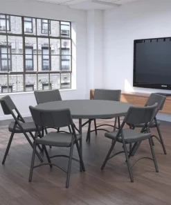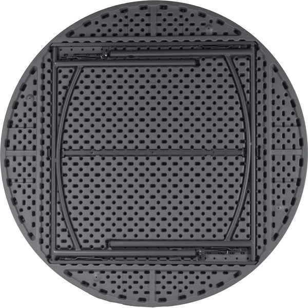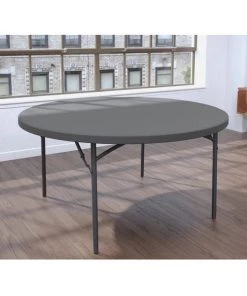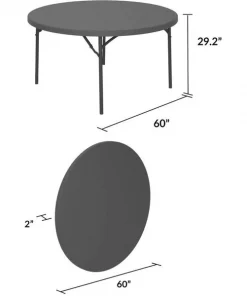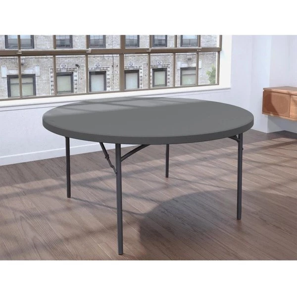 Zown commercial resin round folding table, 60", soley distributed by Cosco, is made from high density resin and can be used indoors or outdoors. Steel frame for durability. Easy to set up, taken down and transport. Non marring foot caps. 750 lbs. capacity. All shark grey color. Open dimensions 60" x 29.2". Table is light weight at 49.18 lbs.