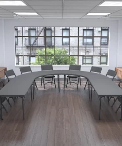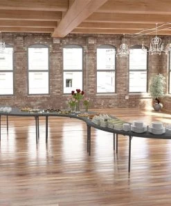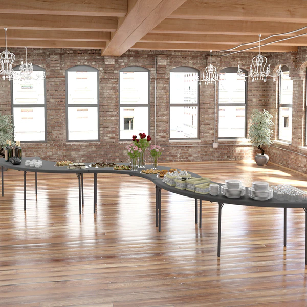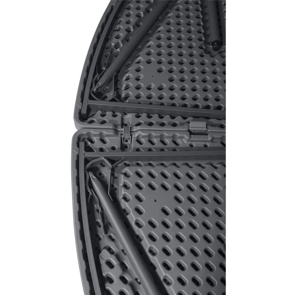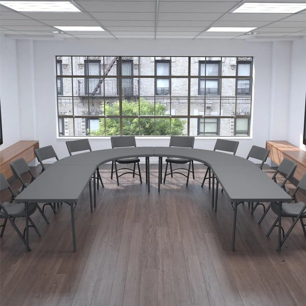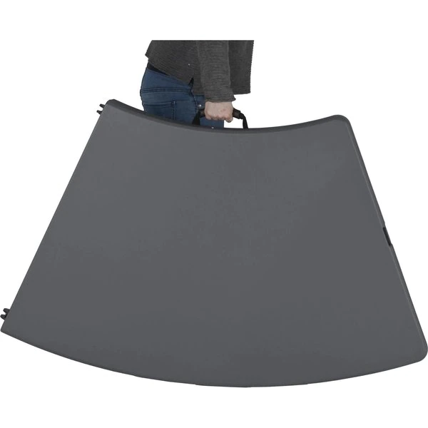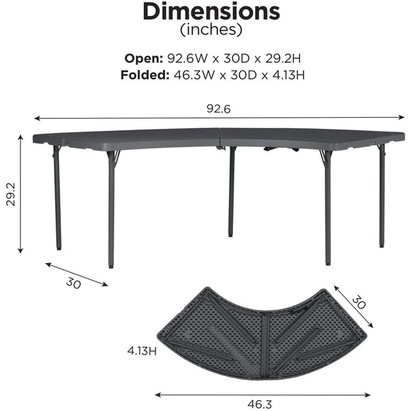Zown commercial resin folding moon shaped (crescent) fold in half table, solely distributed by Cosco, is a multipurpose table. Made from high density resin and can be used indoors or outdoors. Steel frame for durability. Easy to set up, taken down and transport. Non marring foot caps. 200lbs. capacity. All shark grey color. Open dimensions 96" x 30" x 29.2". Table is light weight at 41 lbs.